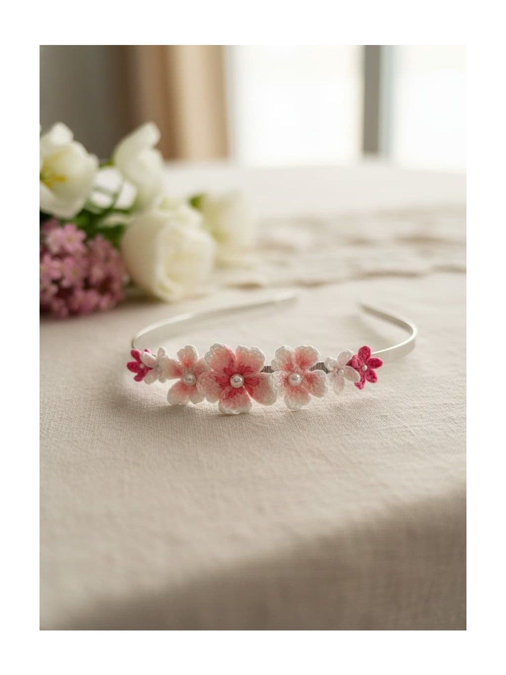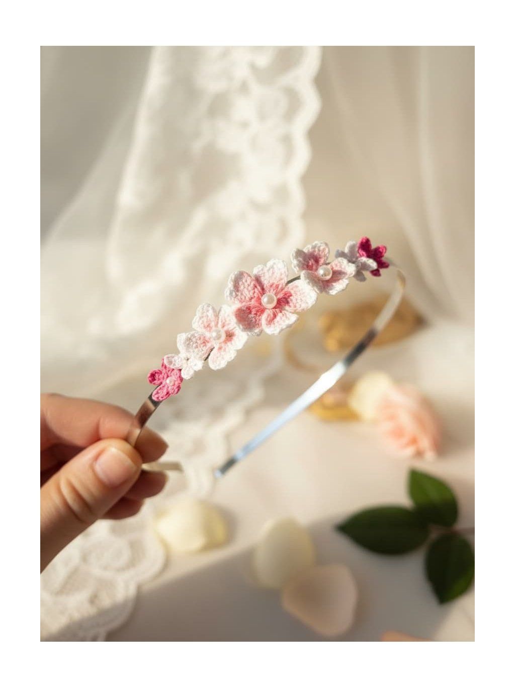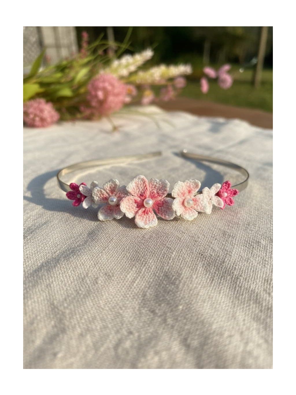 Tato čelenka s růžovými květy je ručně vyráběná a věnovaná ženám, které oceňují jemnost a eleganci v každodenním životě.