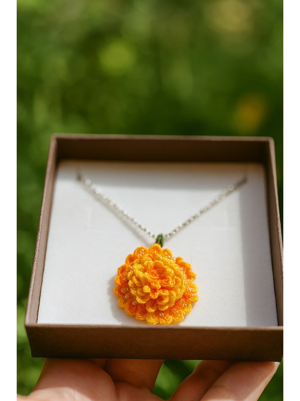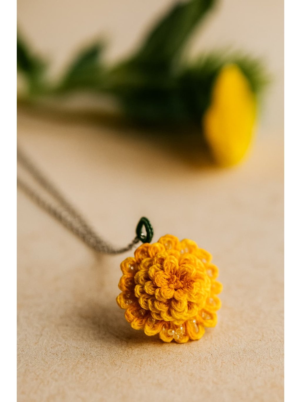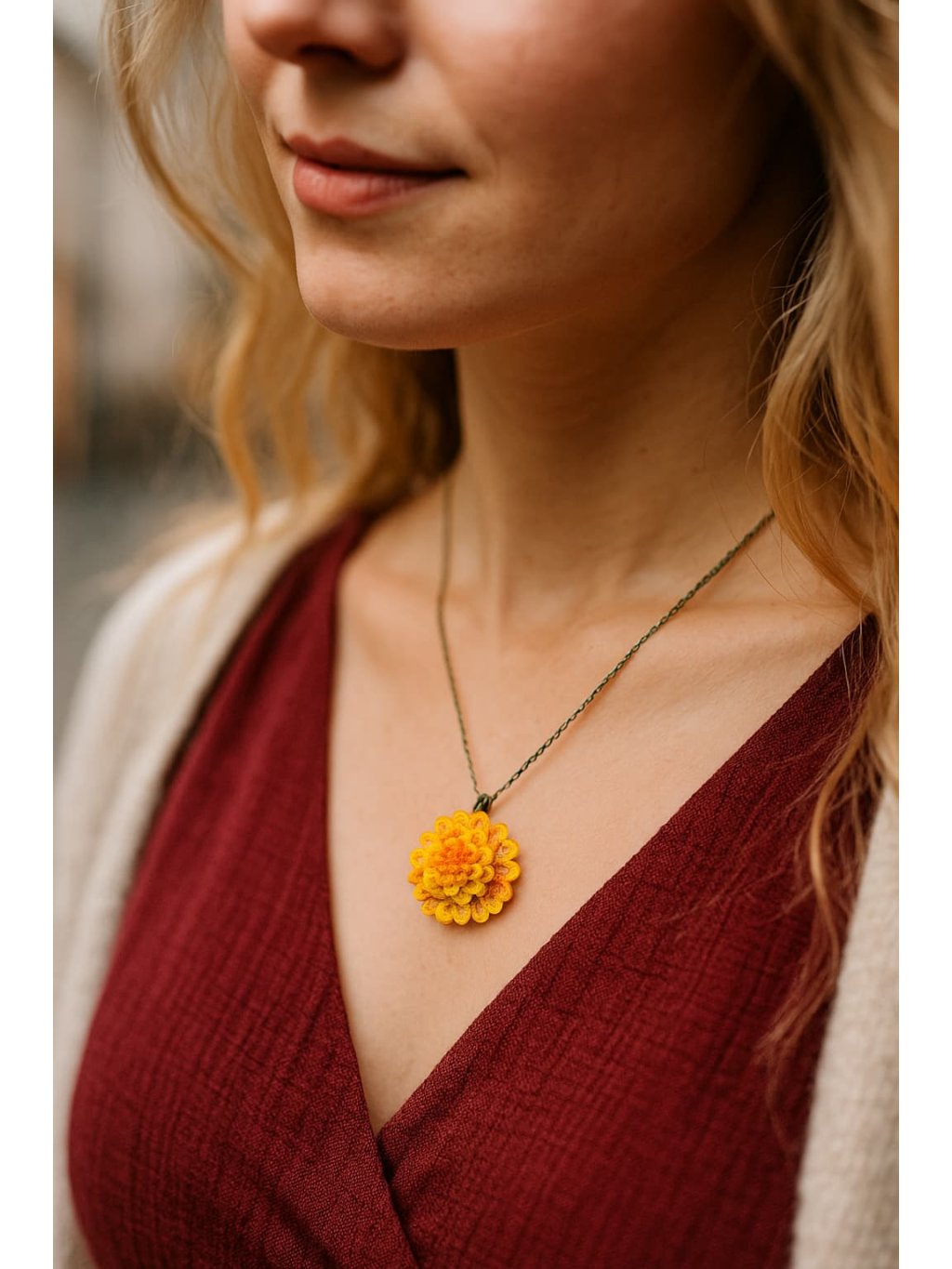 Řetízek s přívěskem Aksamitník – ručně háčkovaný šperk, který vám při každém nošení vnese do duše radost, optimismus a pocit lehkosti. Květina narozených v říjnu, talisman vitality a ženské síly.
