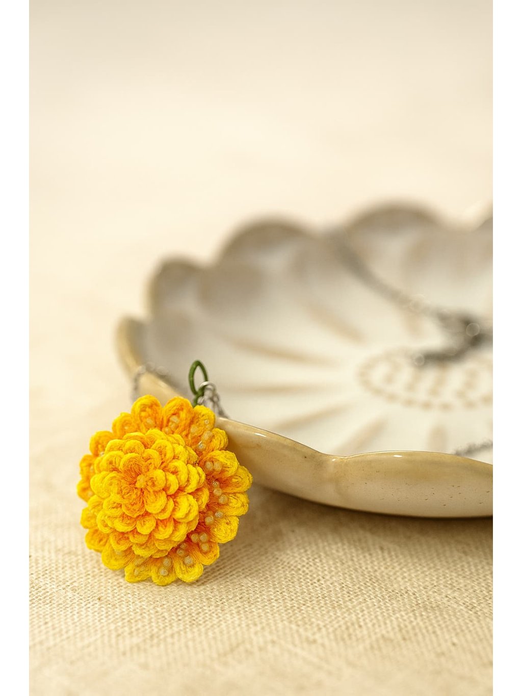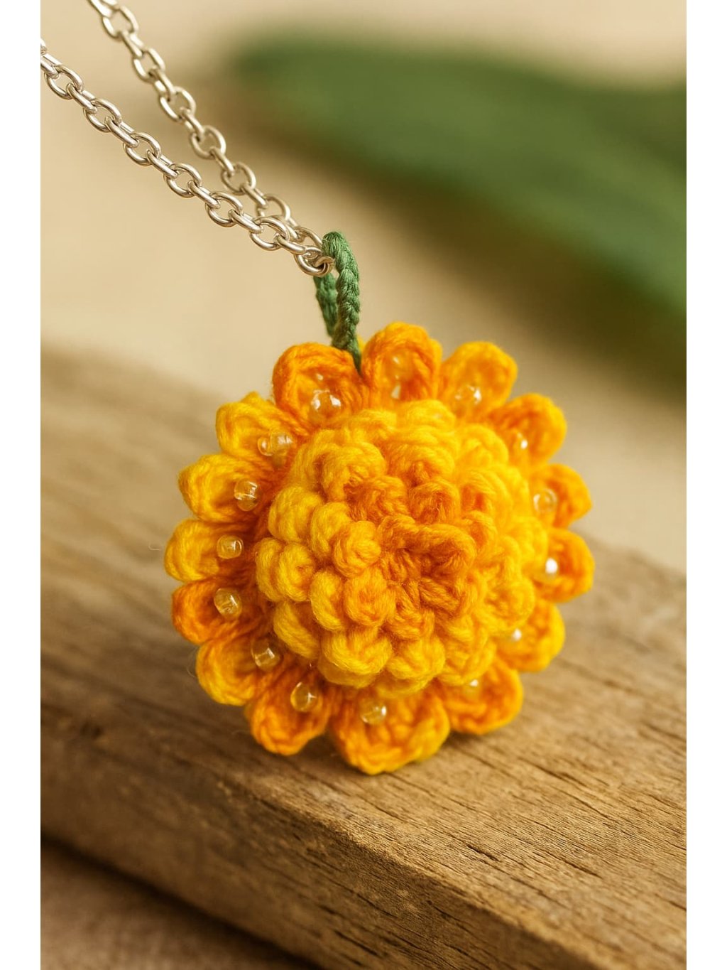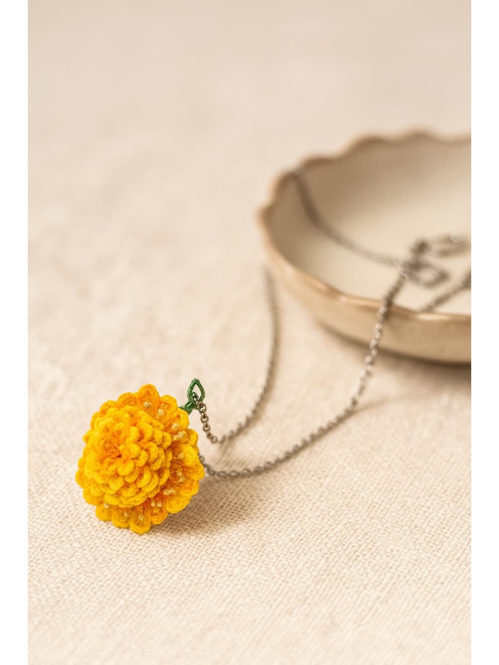 Řetízek s přívěskem Aksamitník – ručně háčkovaný šperk, který vám při každém nošení vnese do duše radost, optimismus a pocit lehkosti. Květina narozených v říjnu, talisman vitality a ženské síly.