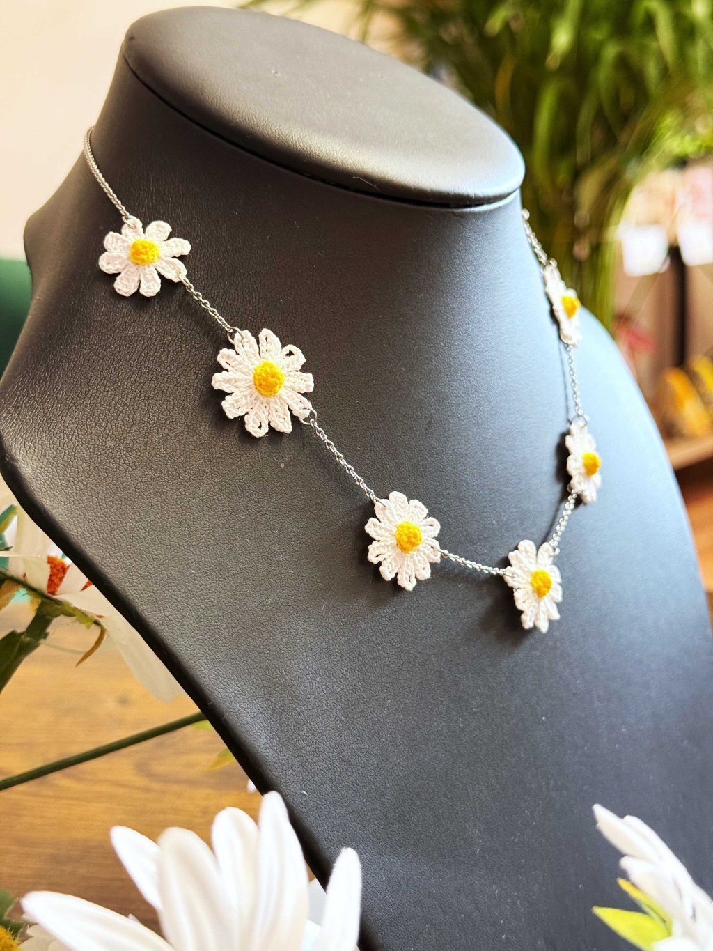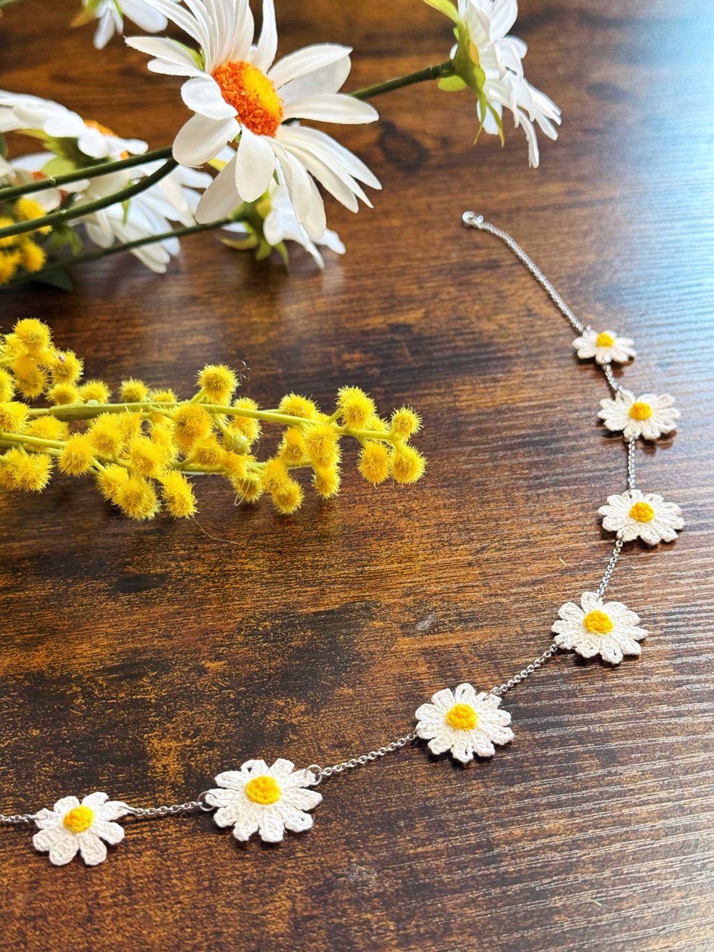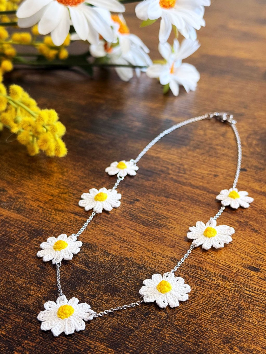 Jemný náhrdelník poskládaný z ručně háčkovaných kopretin, který probouzí vaši vnitřní vílu. Pro chvíle, kdy chcete být sama sebou – něžná, svobodná, zářivá.