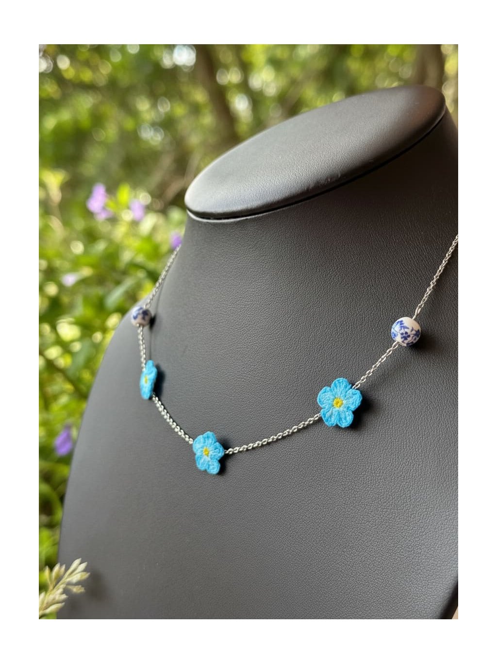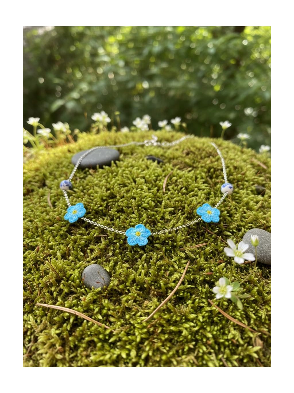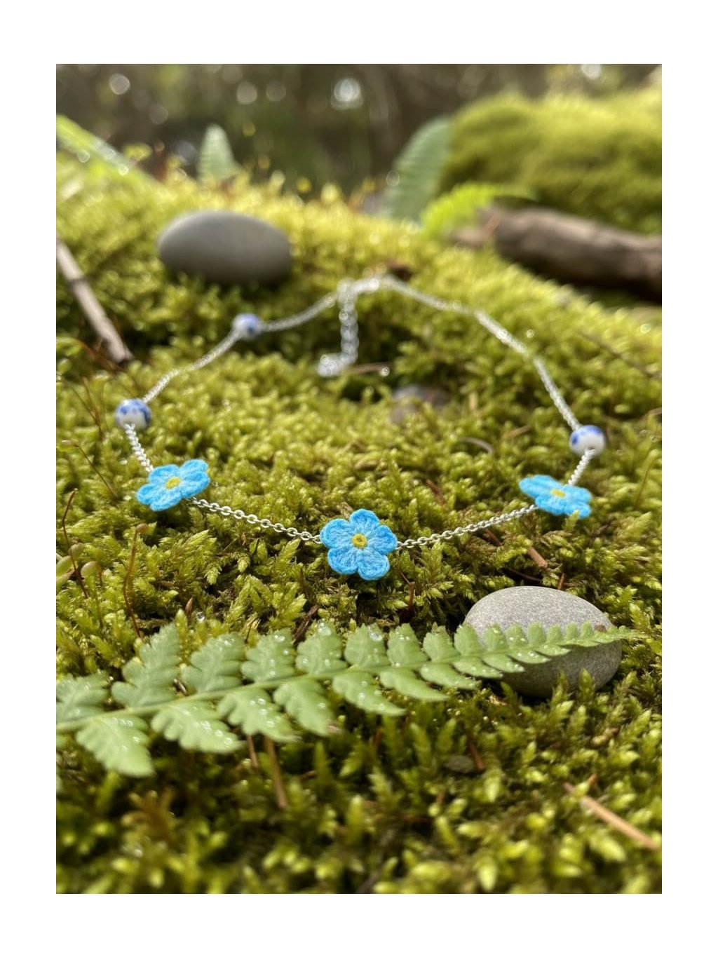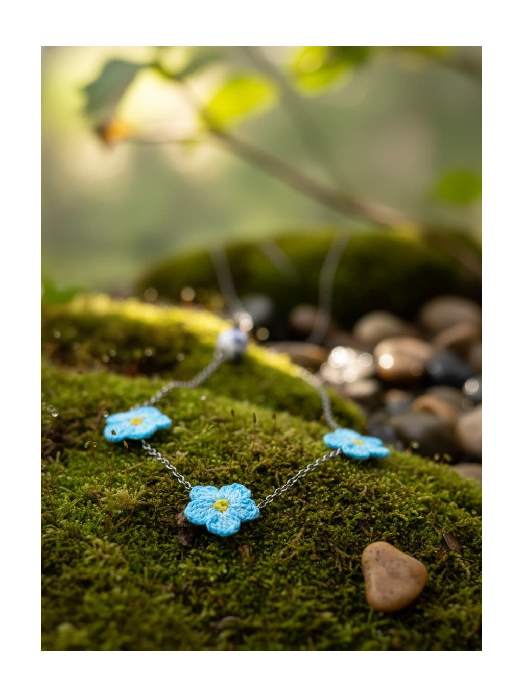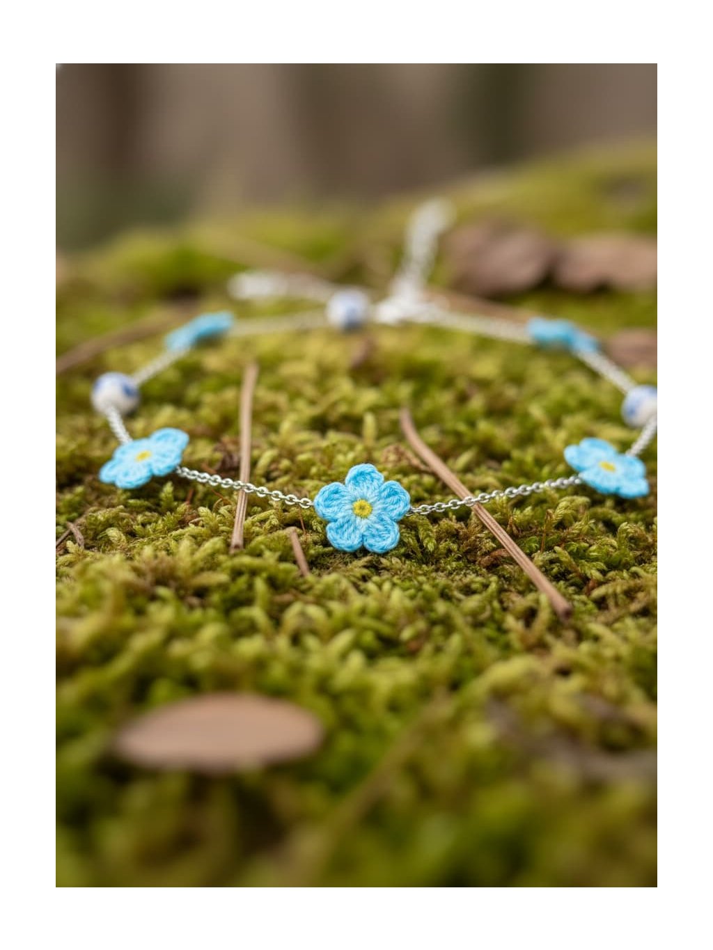 Náhrdelník Pomněnky – nezapomeň na krásu okamžiku  Náhrdelník Pomněnky jsem tvořila s myšlenkou na jemný talisman, který bude připomínat, že ty nejkrásnější chvíle v životě stojí za to si uchovat v srdci. Každý drobný modrý květ je ručně háčkovaný technikou micro crochet, s citem pro detail a lehkost. Kvítky jsou poskládané tak, aby působily jako živý hrozen pomněnek – něžný, hravý a autentický.