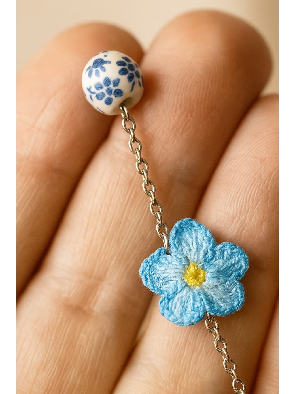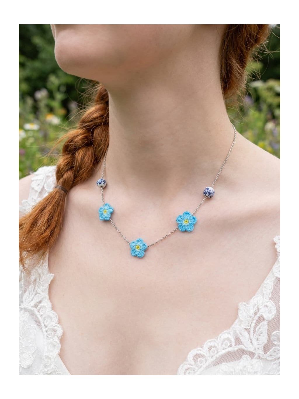 Náhrdelník Pomněnky jsem tvořila s myšlenkou na jemný talisman, který bude připomínat, že ty nejkrásnější chvíle v životě stojí za to si uchovat v srdci. Každý drobný modrý květ je ručně háčkovaný technikou micro crochet, s citem pro detail a lehkost. Kvítky jsou poskládané tak, aby působily jako živý hrozen pomněnek – něžný, hravý a autentický.