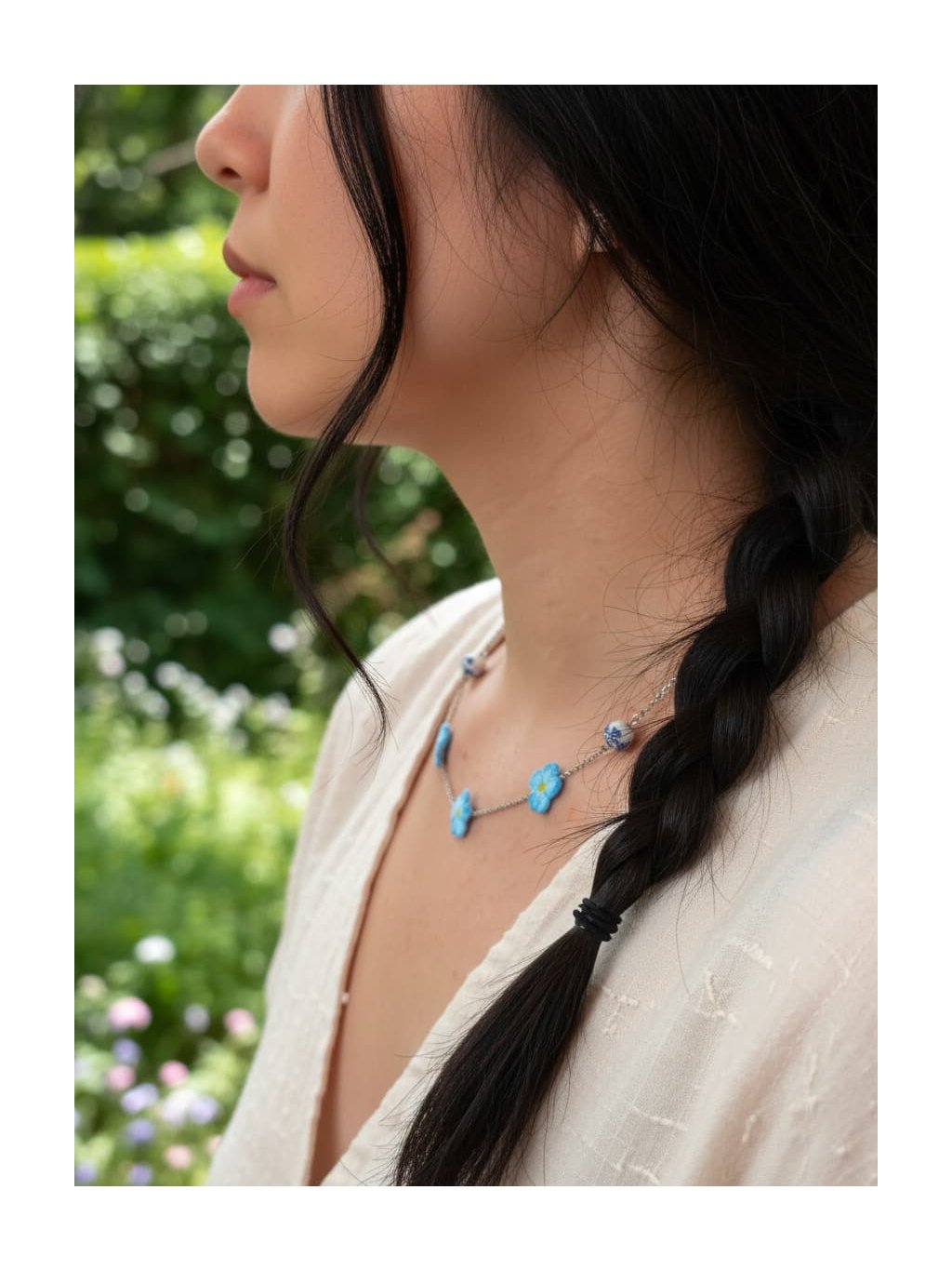 Náhrdelník Pomněnky zkombinujte s letními bílými šaty bez ramínek – modré kvítky nádherně vyniknou na opálené pokožce a dodají outfitu něhu i romantický akcent. Perfektní volba na letní večer nebo zahradní slavnost.