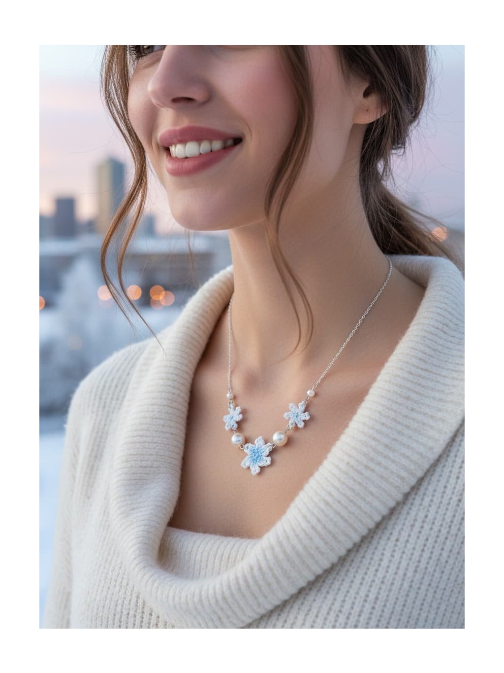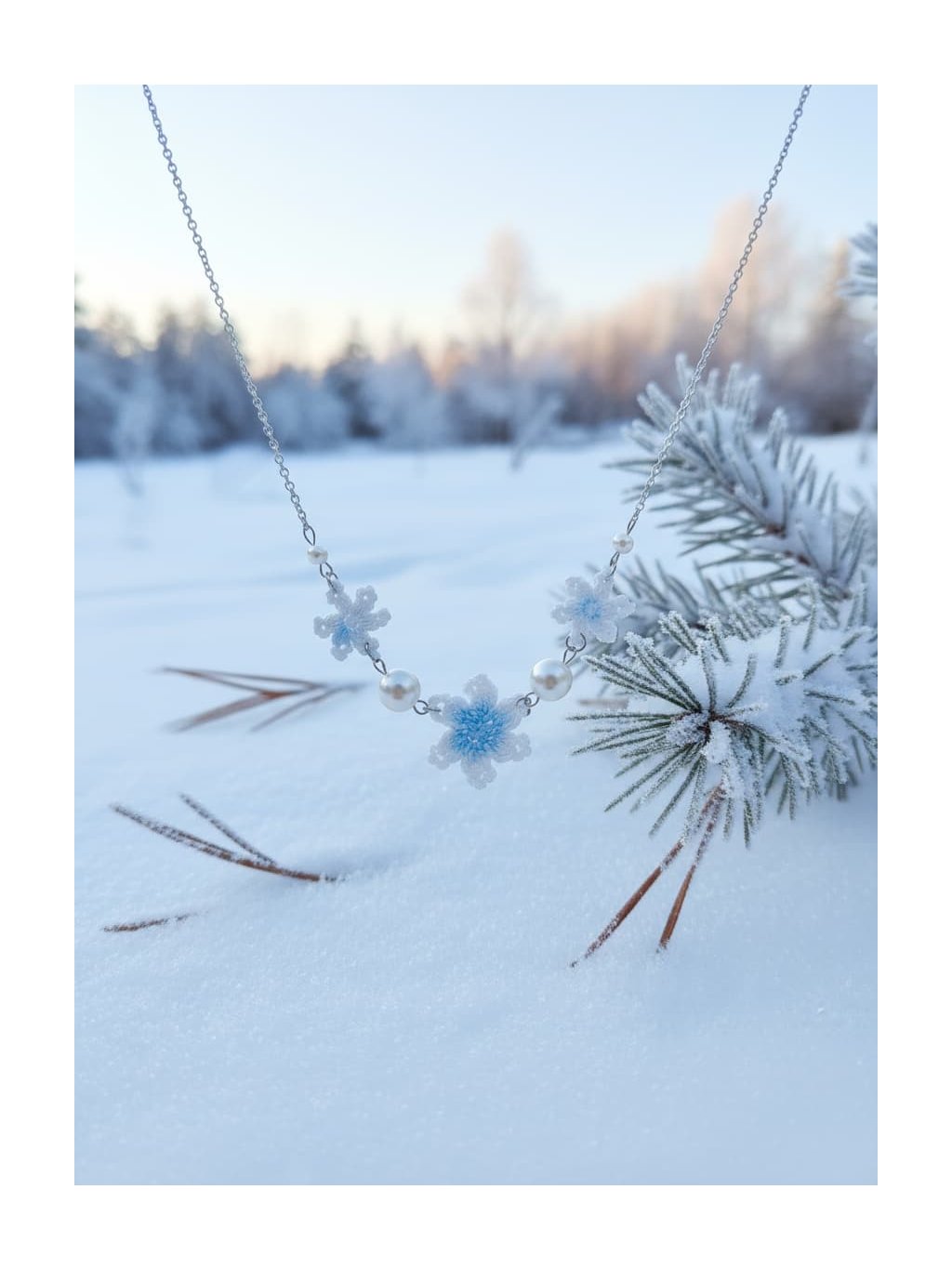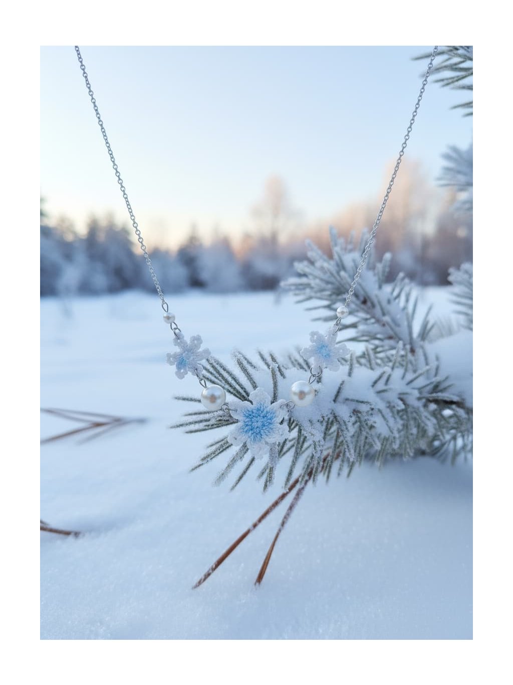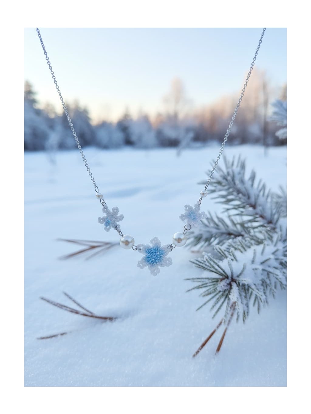 🎁Styling tip: Zkombinujte náhrdelník s bílou nebo krémovou halenkou s výstřihem do V a nechte ho spočinout přesně v nejhlubším bodě výstřihu. Přidejte jemný kardigan v odstínu ledově modré nebo šedé a vlasy si upravte do nízké drdolky s několika volnými pramínky u obličeje. Tento look dokonale podtrhne křehkou krásu náhrdelníku a vytvoří harmonii mezi vaší přirozenou elegancou a zimní poetikou šperku.