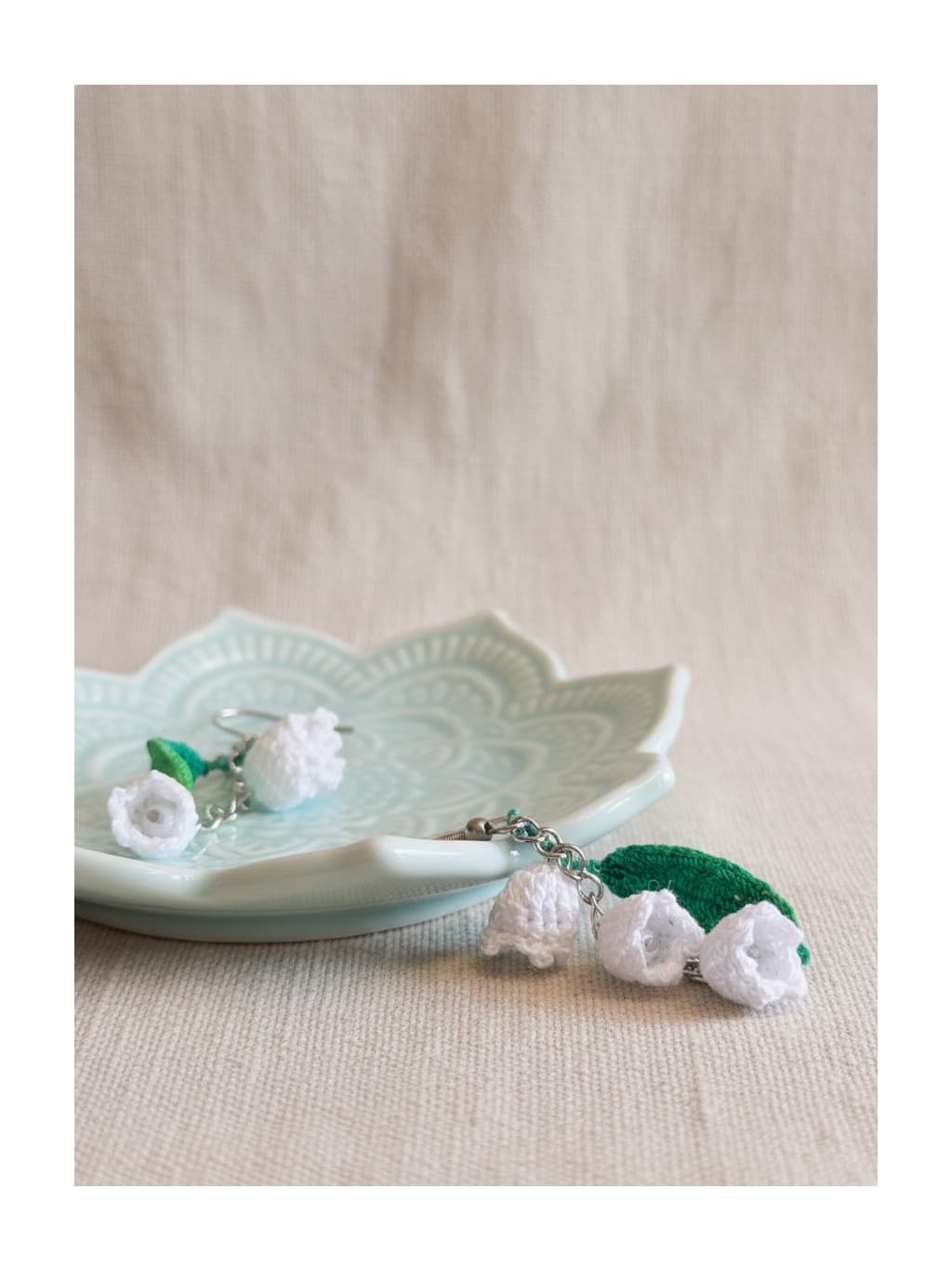 Visací náušnice Konvalinka královen jsou vytvořené ručně v technice micro crochet. Každý drobný květ je pečlivě vypracovaný tak, aby zachytil lehkost a eleganci této výjimečné květiny. Při nošení se kvítky jemně pohupují a přinášejí pocit harmonie, jemnosti a klidu.