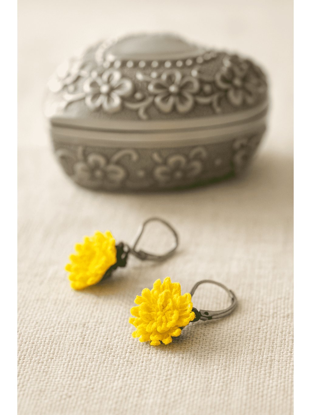 Tyto visací náušnice jsem vytvořila právě proto, abychom si mohly tuhle dětskou radost připomínat i v dospělosti. Každý žlutý květ je ručně háčkovaný v technice micro crochet, jemný a lehký, doplněný o dámský patent, aby se náušnice pohodlně nosily a při chůzi se s lehkostí pohupovaly – jako pampeliška ve větru.