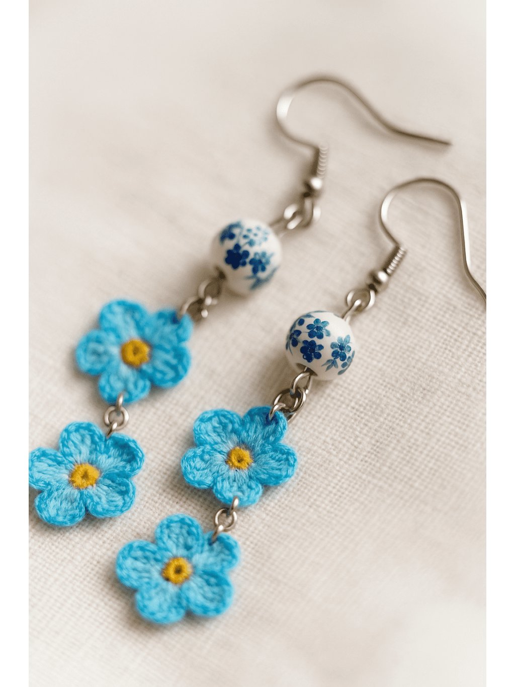 Tyto náušnice jsem tvořila s představou šperku, který v sobě ponese tuhle něhu i hloubku. Každý květ je ručně háčkovaný v technice micro crochet, aby zachytil tu jemnost a čistotu, jakou mají pomněnky v přírodě. Při nošení se lehce pohupují, takže působí živě a dodají Vám ten nenápadný, ale působivý detail, který si okolí všimne.