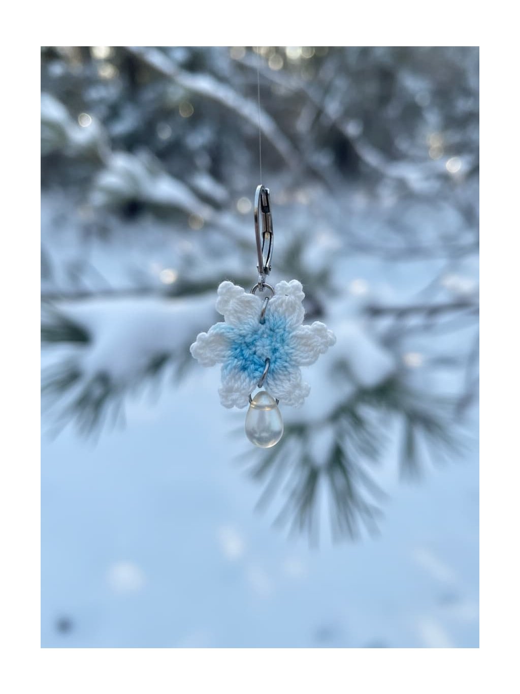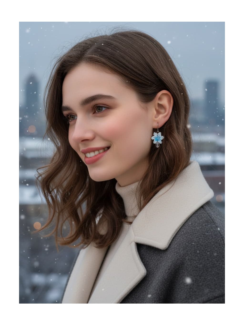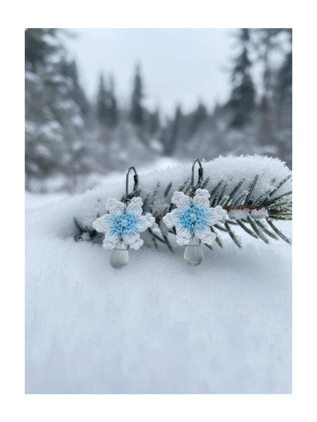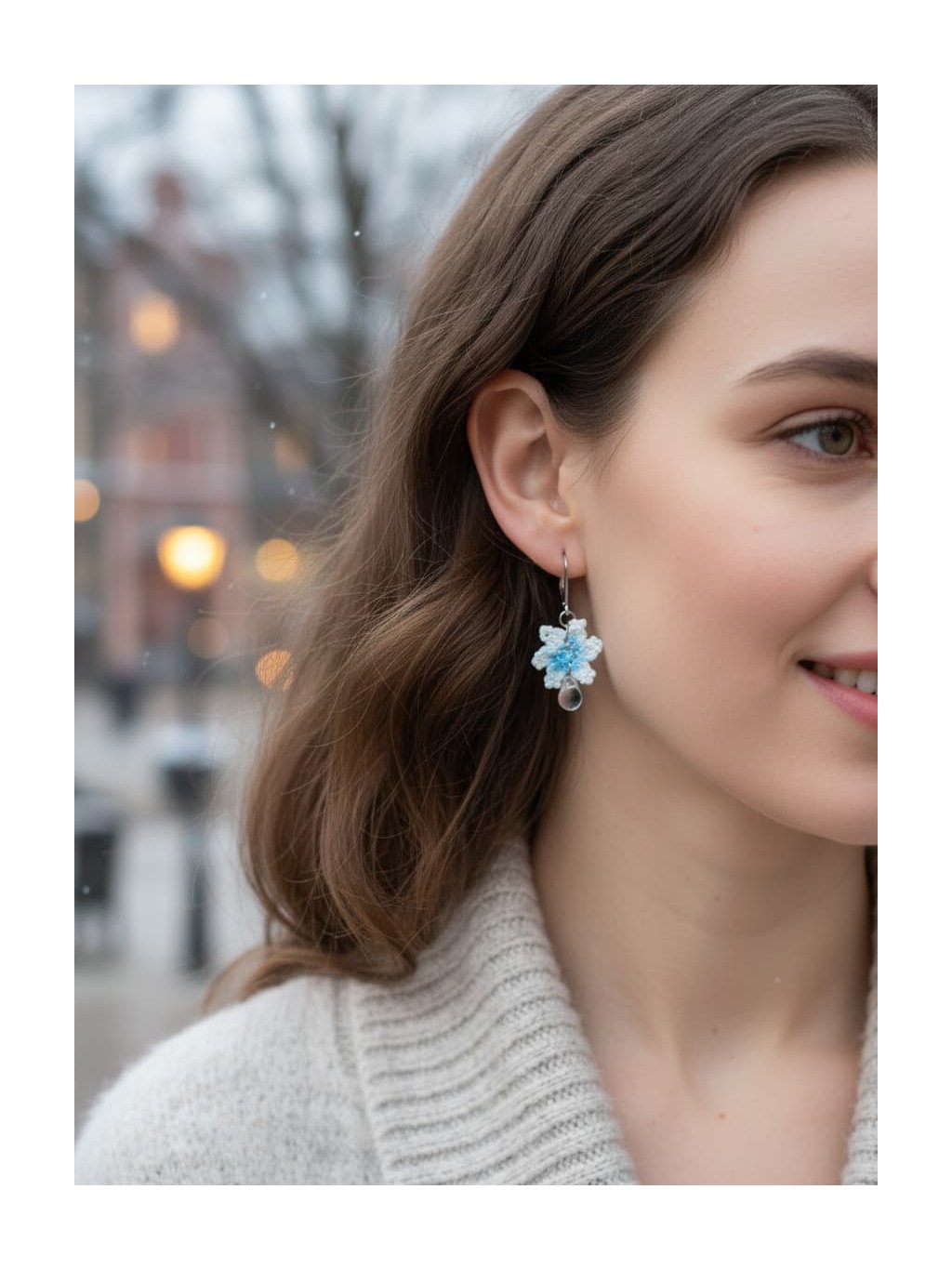 🎁Styling tip: Zkombinujte tyto náušnice s vysokým culíkem nebo elegantním drdolem a nechte je volně viset podél čisté linie krku. Oblečte si jednobarevný svetr v odstínu ledově modré nebo krémově bílé a přidejte jemný šátek v neutrálním tónu. Tento look dokonale podtrhne křehkou krásu náušnic a vytvoří harmonii mezi vaší přirozenou elegancí a zimní poetikou šperku.