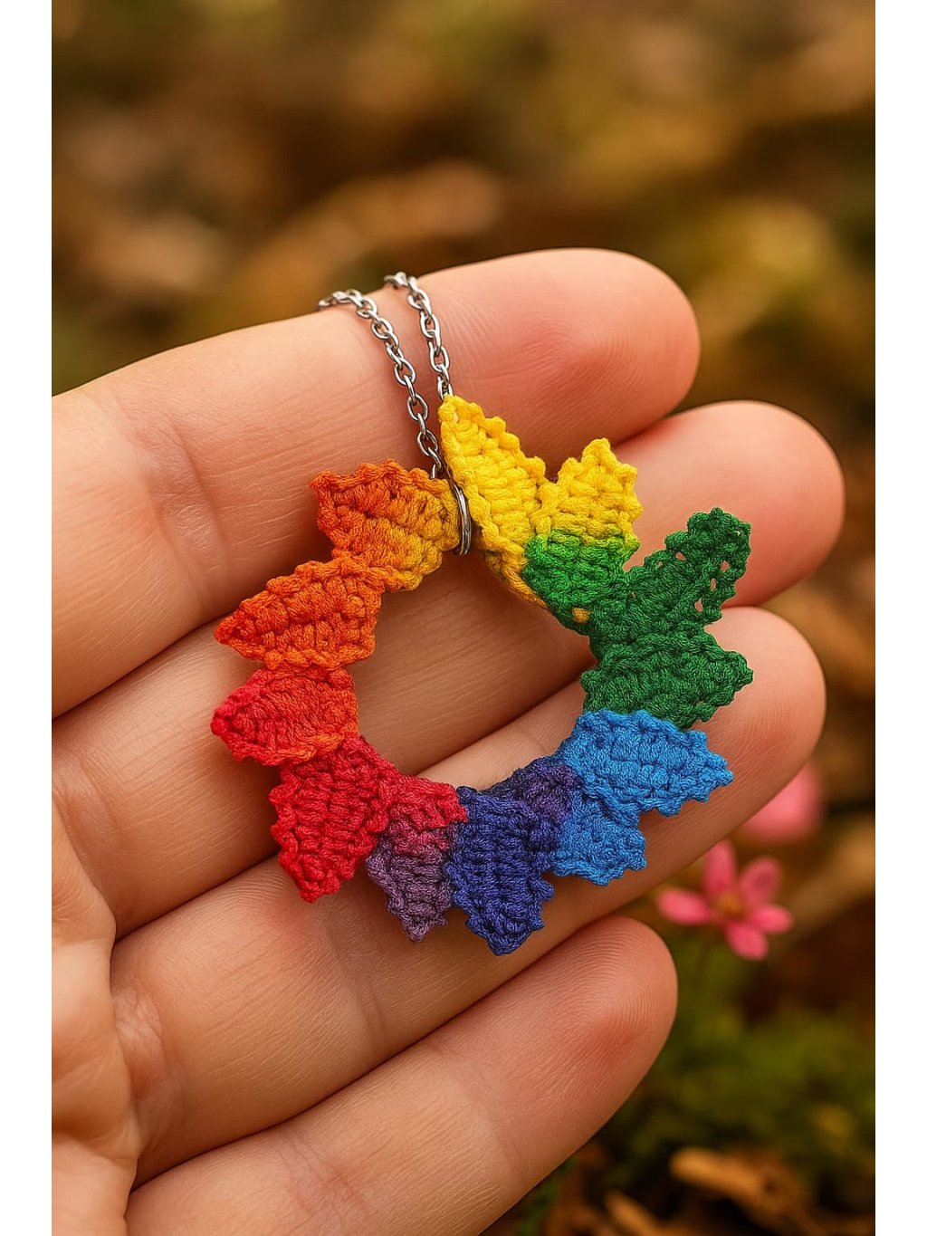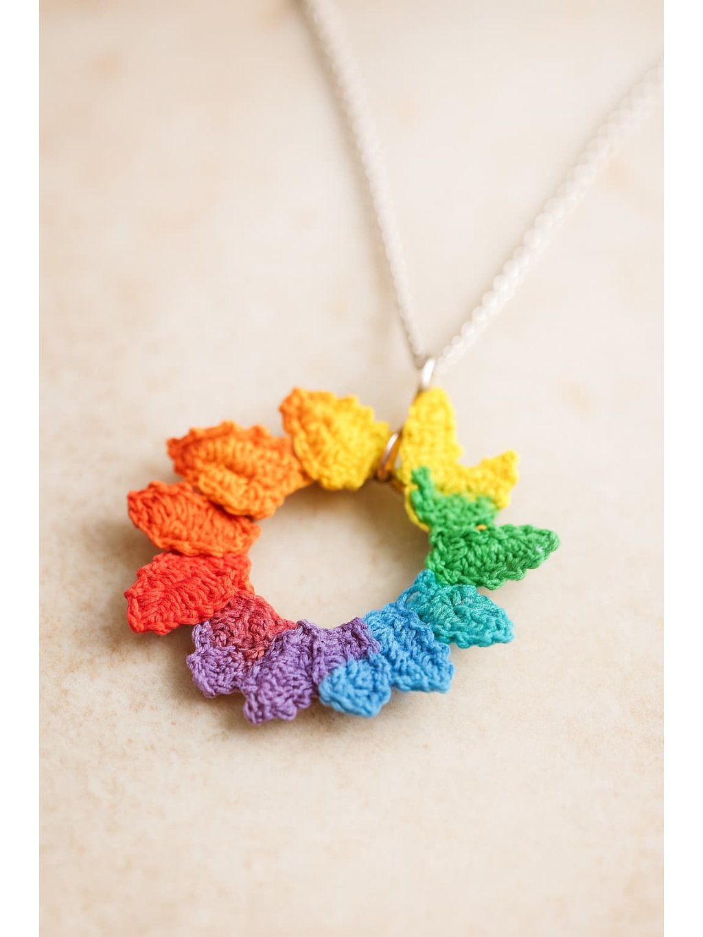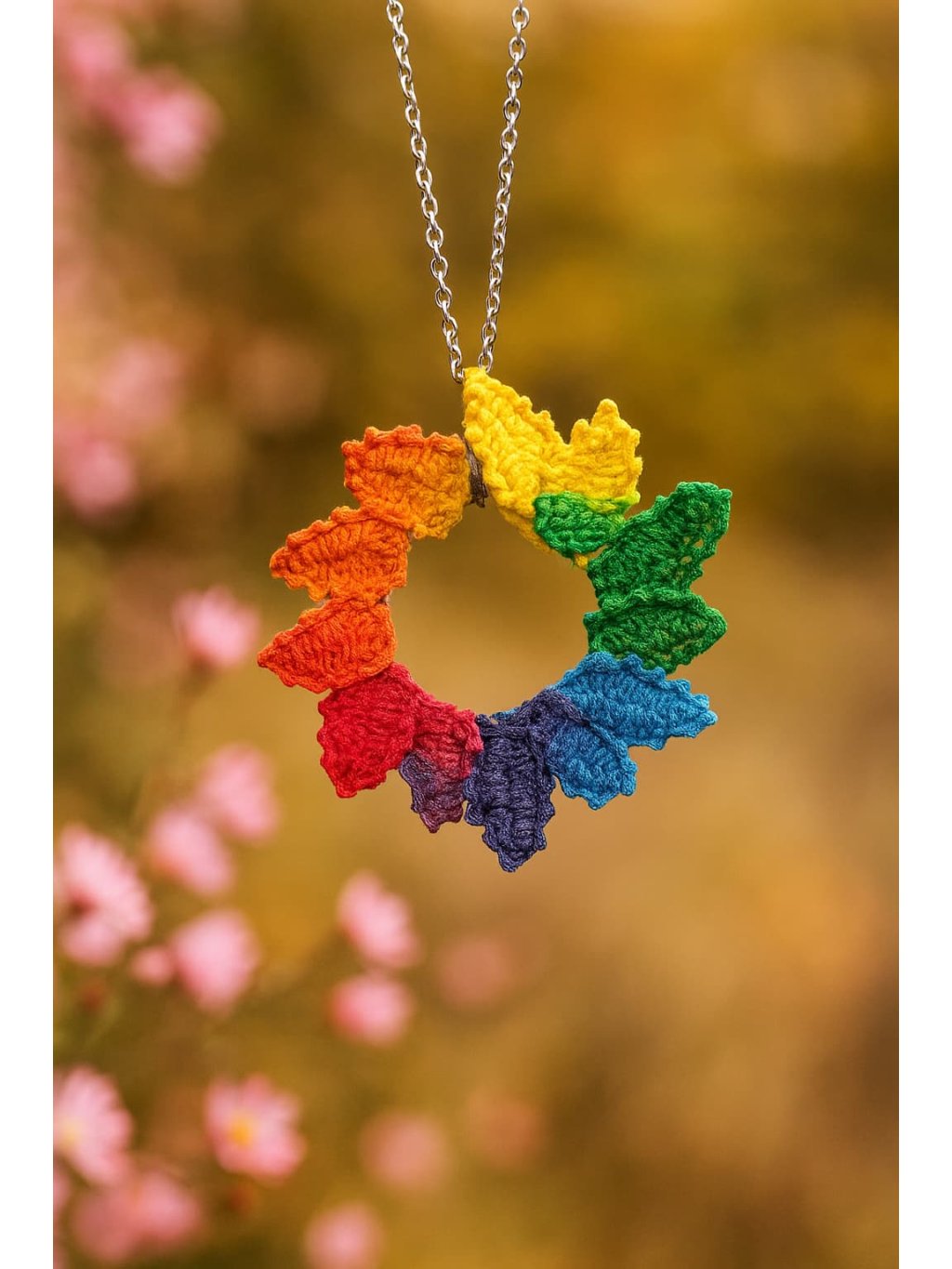 Každý lístek je ručně háčkovaný technikou micro crochet, díky které vynikne jemná struktura i detail. Náhrdelník působí lehce a hravě, přitom má hlubokou symboliku – je talismanem harmonie a připomínkou, že i v šeru a mlze podzimu může zářit barevnost.