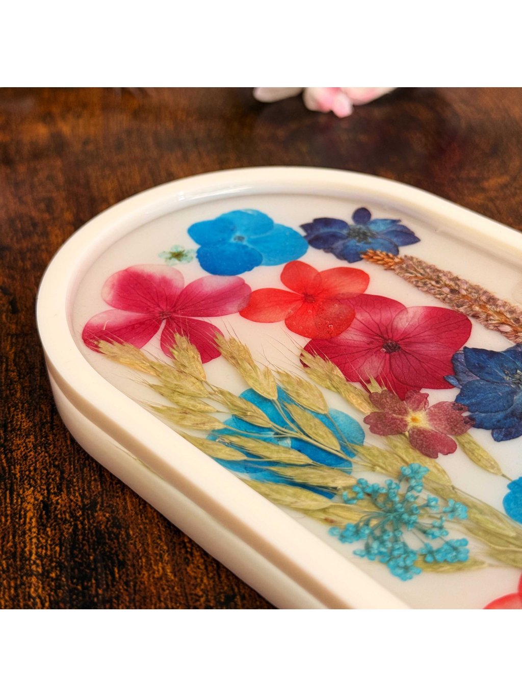 Barevné tácky z pryskyřice s usušenými květy – jako by kousek léta zůstal u vás doma. Každý kus je originál, který vnese do interiéru radost a jemnost přírody.