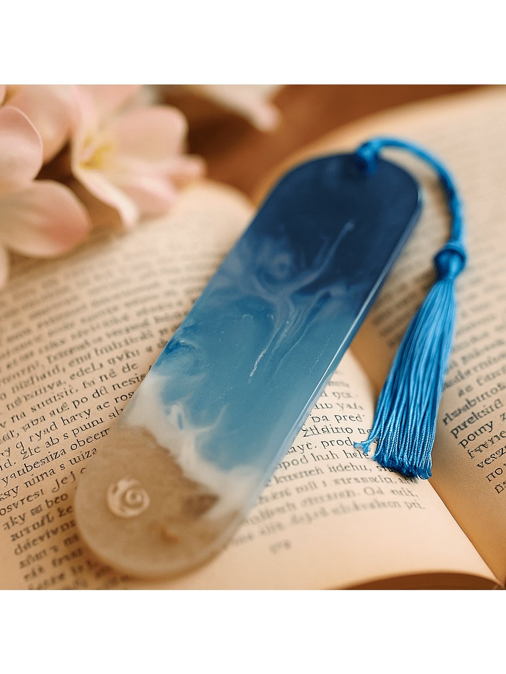 Každý kousek je malým uměleckým dílem – uvnitř pryskyřice se ukrývá jemný motiv pláže a moře, doplněný skutečnými mušličkami, které přinášejí do vašeho čtení dotek léta.